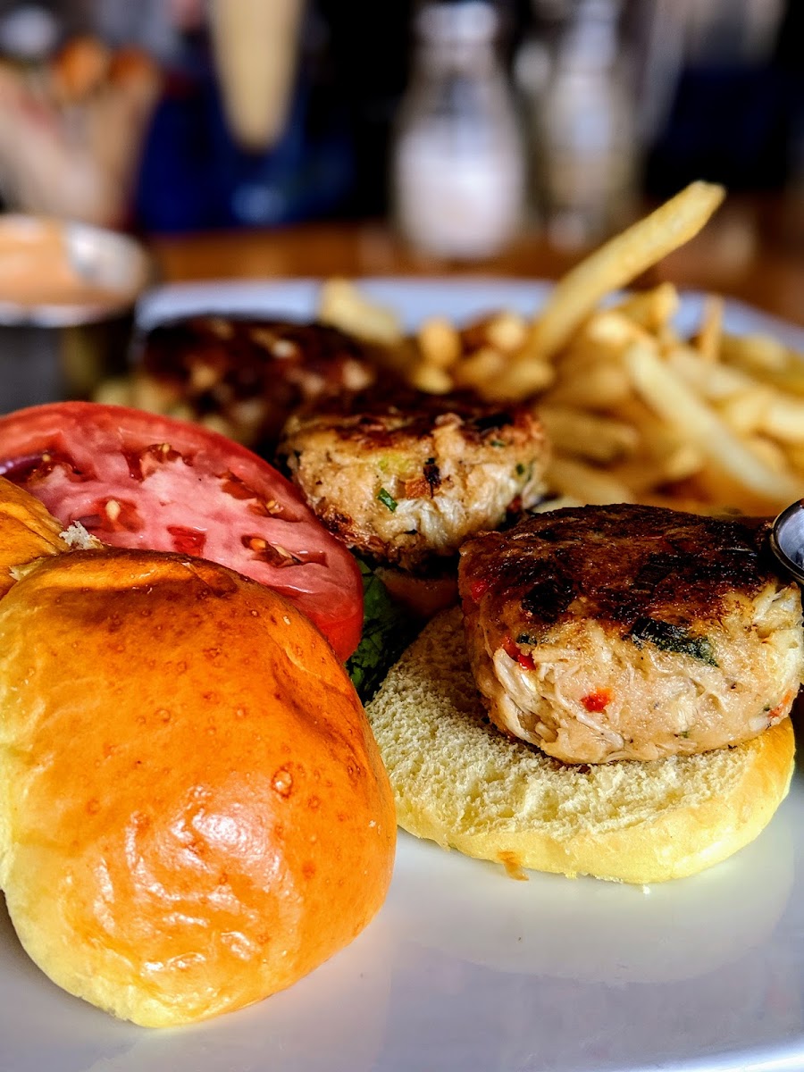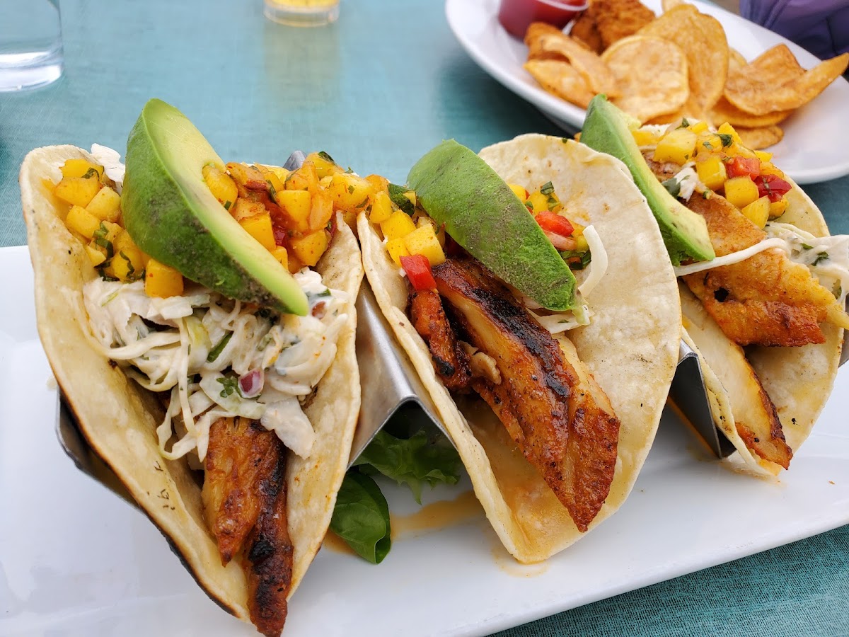 - Fish Tacos: Blackened tilapia topped with mango-pineapple salsa and cilantro-lime slaw.